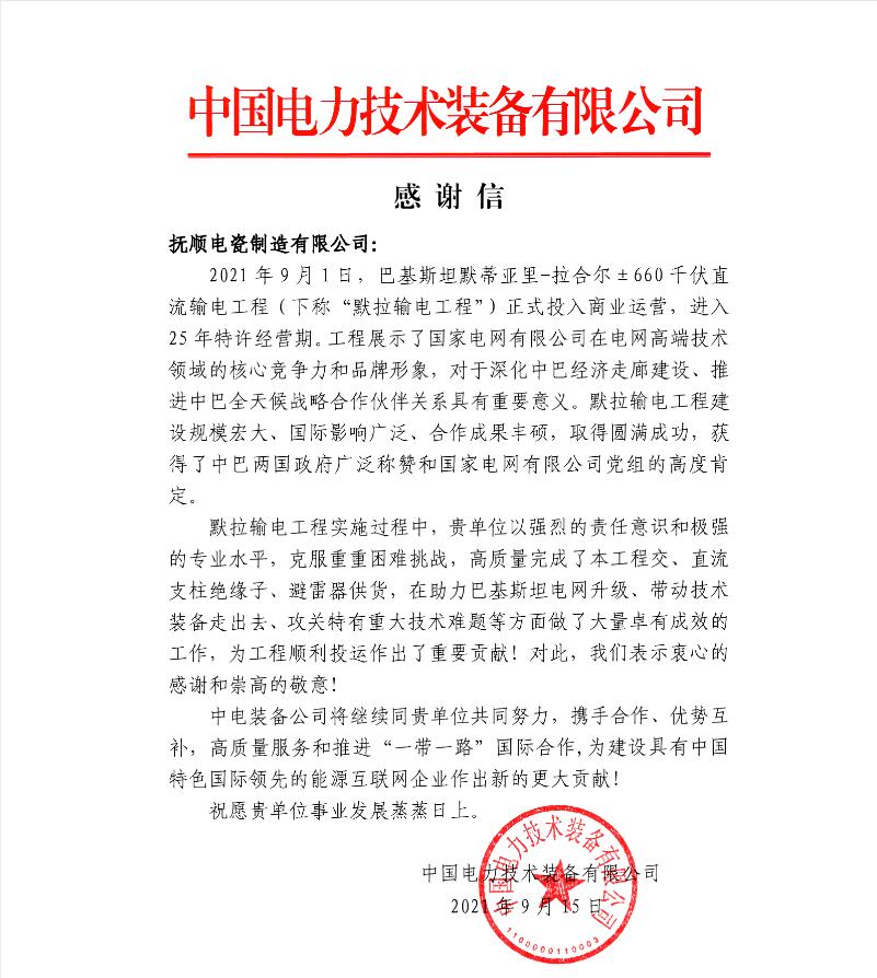 近日,在“默拉輸電工程”投入商業(yè)運(yùn)營之際,我公司喜獲中國電力技術(shù)裝備有限公司感謝信,“中電裝備”高度評價了我公司在“默拉輸電工程”中克服重重困難挑戰(zhàn),以強(qiáng)烈的責(zé)任意識、專業(yè)的服務(wù)水平,高質(zhì)量的完成了交貨任務(wù);同時頒發(fā)給撫瓷公司獎狀和表彰個人的徽章。